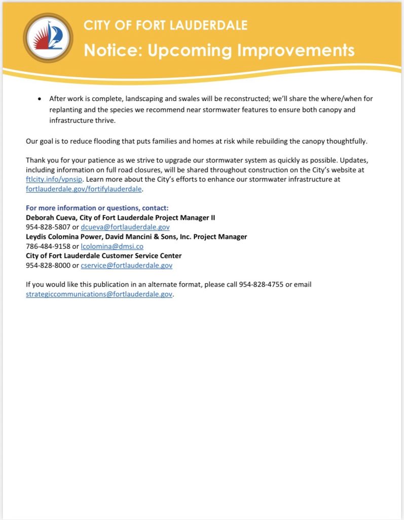 If you have any questions, please contact Project Manager II Deborah Cueva at 954-828-5807 or dcueva@fortlauderdale.gov.