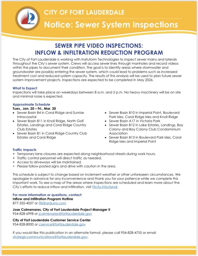 The attached flyer includes information about upcoming sewer pipe video inspections that will take place between January 20 to March 20, 2026. These inspections are part of the City’s ongoing efforts to identify portions of the sewer system where stormwater and groundwater are possibly entering the system, which leads to problems such as increased treatment cost and reduced system capacity.